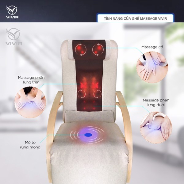 Ghế massage VIVIR được trang bị hệ thống con lăn massage Thái cho toàn bộ vùng lưng, gối massage vai gáy cổ và 01 mô tơ rung phần mông, giúp người dùng thả lỏng tinh thần, thư giãn toàn thân, giảm mỏi lưng.