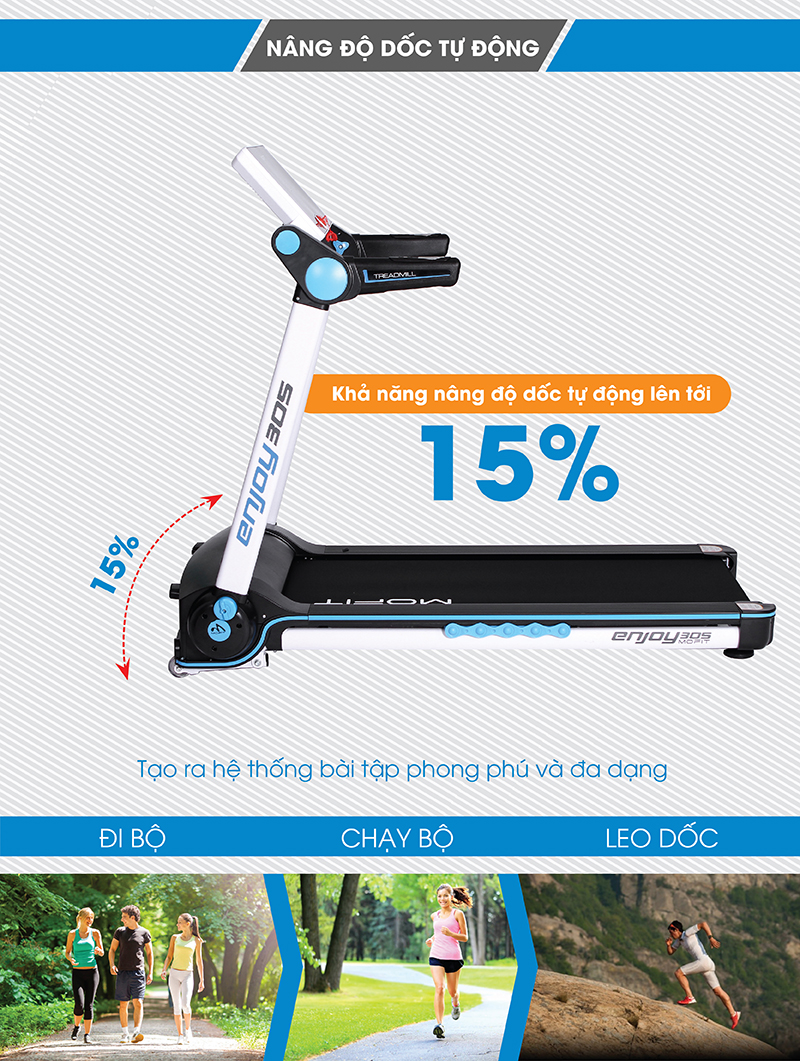 Thay vì tập luyện trên một mặt bằng quá nhàm chán, MOFIT tích hợp cho ENJOY 305 khả năng nâng độ dốc tự động giúp bạn được trải nghiệm cảm giác tập luyện trên mọi địa hình, từ đi bộ, chạy bộ cho đến leo dốc.