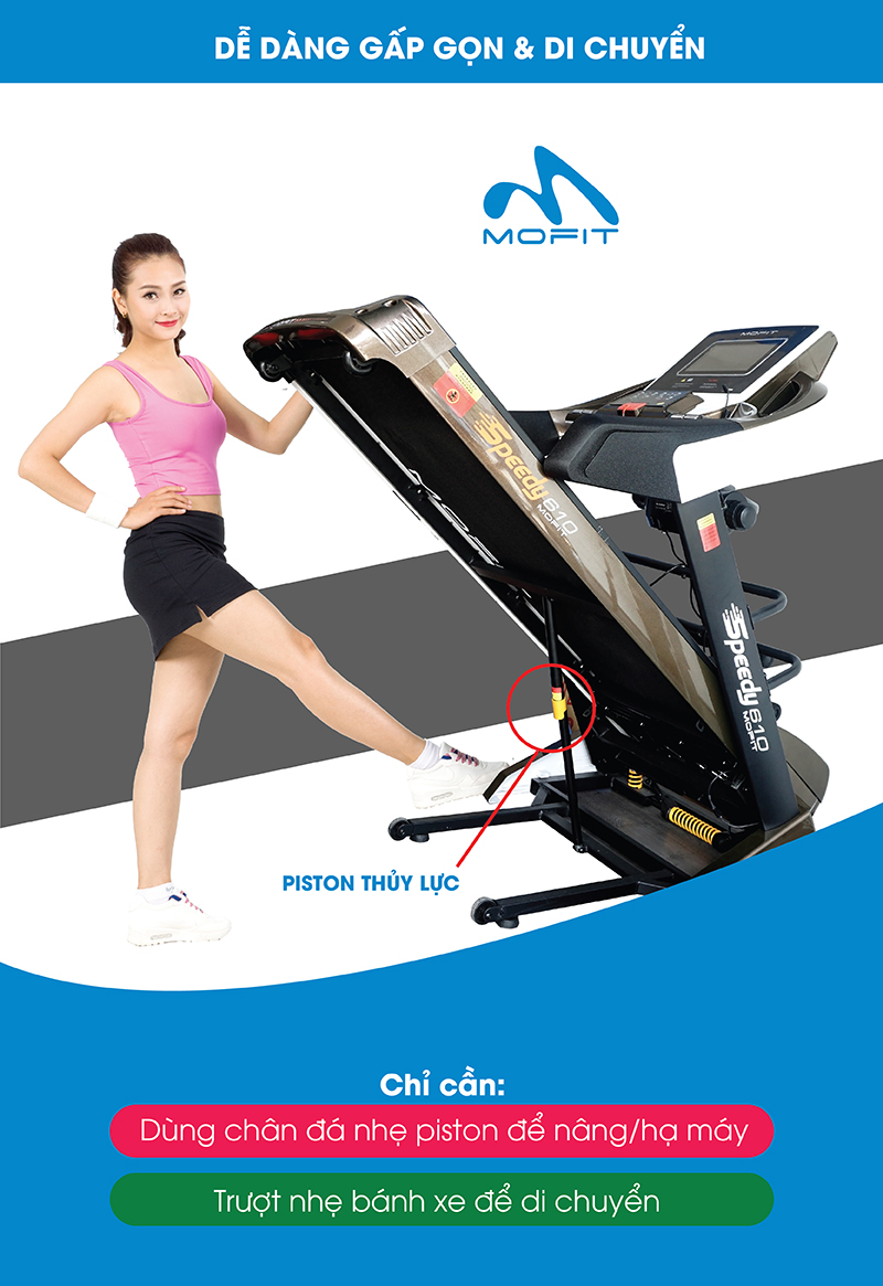Bên cạnh tải trọng lí tưởng, máy SP610 còn dễ dàng gấp gọn, di chuyển. Chỉ cần dùng chân đá nhẹ piston là bạn có thể nâng, hạ máy rồi trượt bánh xe để di chuyển nó dễ dàng. Sản phẩm thích hợp cho cả những gia đình có diện tích nhỏ, hẹp.