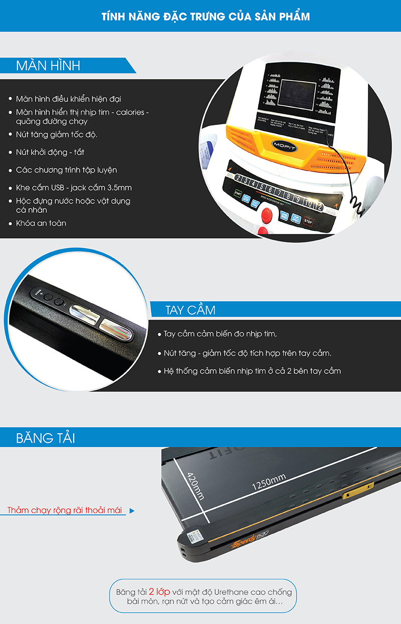 Tốc độ: 1.0 - 12km/h. Độ nghiêng: 3 level 0, 5%, 12%.