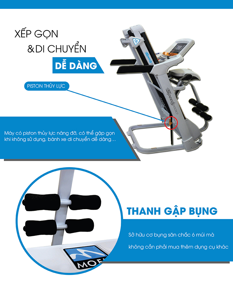 Máy có piston thủy lực nâng đỡ, có thể gập gọn máy để cất giữ khi không sử dụng.