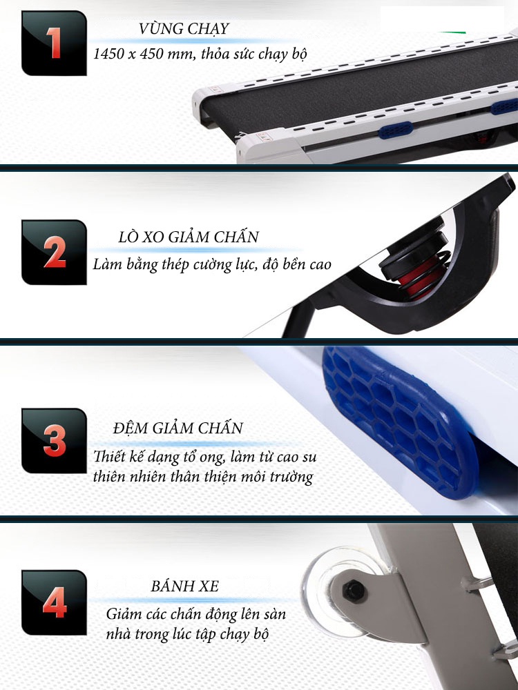 - Bàn chạy được trang bị hệ thống giảm chấn công nghệ mới tạo cảm giác êm ái trong lúc chạy.
