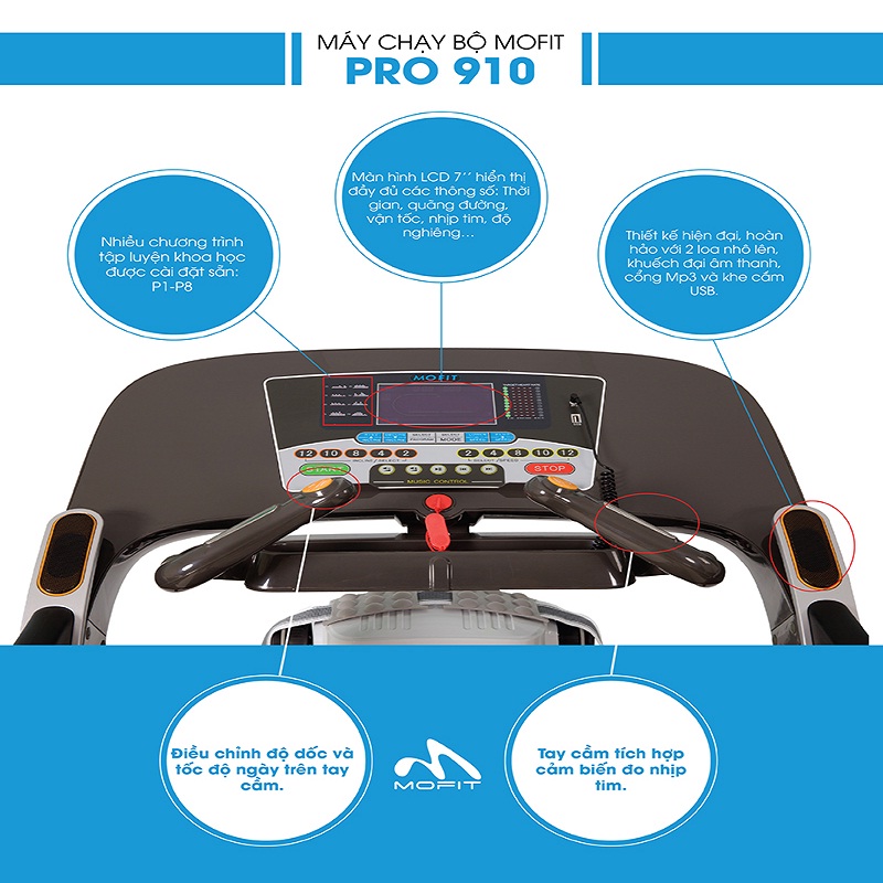 Máy chạy bộ điện cao cấp PRO 910 được nâng cấp từ máy chạy bộ MHT-1430 với nhiều cải tiến vượt trội, máy chạy bộ điện Mofit PRO910 giúp quý vị có trải nghiệm tốt hơn với bài chạy bộ tại nhà.