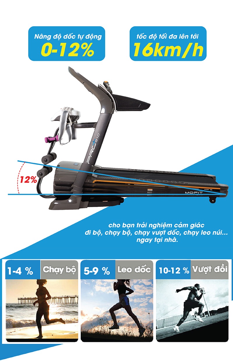 - Tốc độ: 1.0 - 16km/h. Độ nghiêng: 0-12%