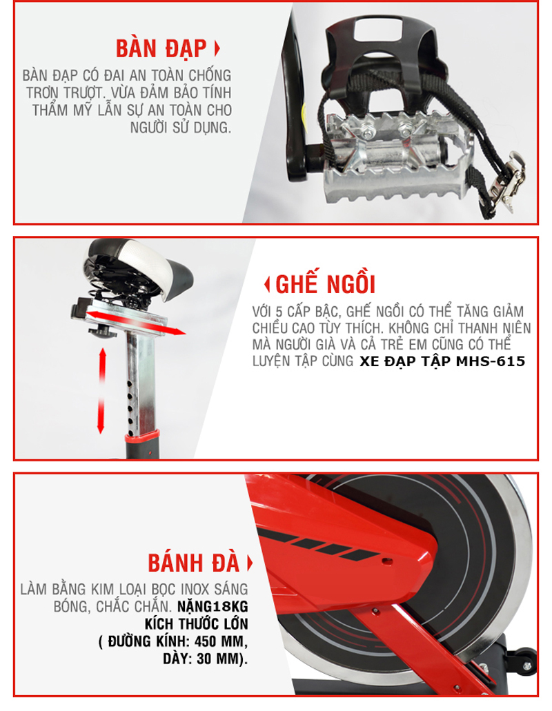 Cải tiến vợt trội đặc biệt lớn nhất ở MHS-615 là hệ thống chuyển động bằng dây cu loa, MHS-615 không sử dụng hệ thống chuyển động bằng xích như tất cả các dòng xe tương tự khác. Vì vậy MHS-615 luôn đem lại cảm giác êm dịu trong từng bước đạp, với hệ thống chuyển động bằng dây Cu loa MHS-615 luôn có độ bền cao hơn và trong 1 thời gian dài bạn không phải thay thế phụ kiện như xe dùng chuyển động bằng xích.